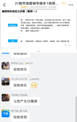 就“销售经历”这个问题,老师与张莉同学和王博洋同学进行了连麦,分别让大家了解了销售的成功与失败案例;“口红商品”的互动选取了单亚茹同学进行交流,为大家讲解了销售基本功的重要性。