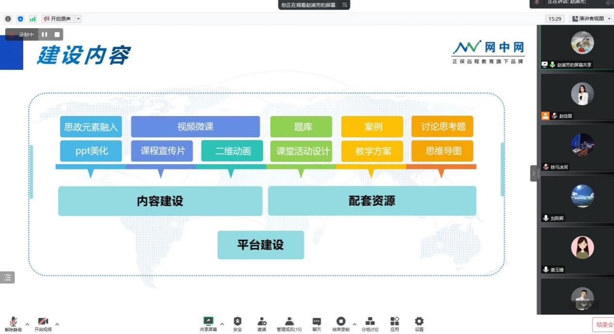 姜玉婕首先结合公司的近期工作部署,对一流课程建设进行了说明,并对正保网中网公司的基本情况和服务做了介绍。然后正保金课咨询师赵书芳对课程建设运行等具体内容做了详细的讲解。