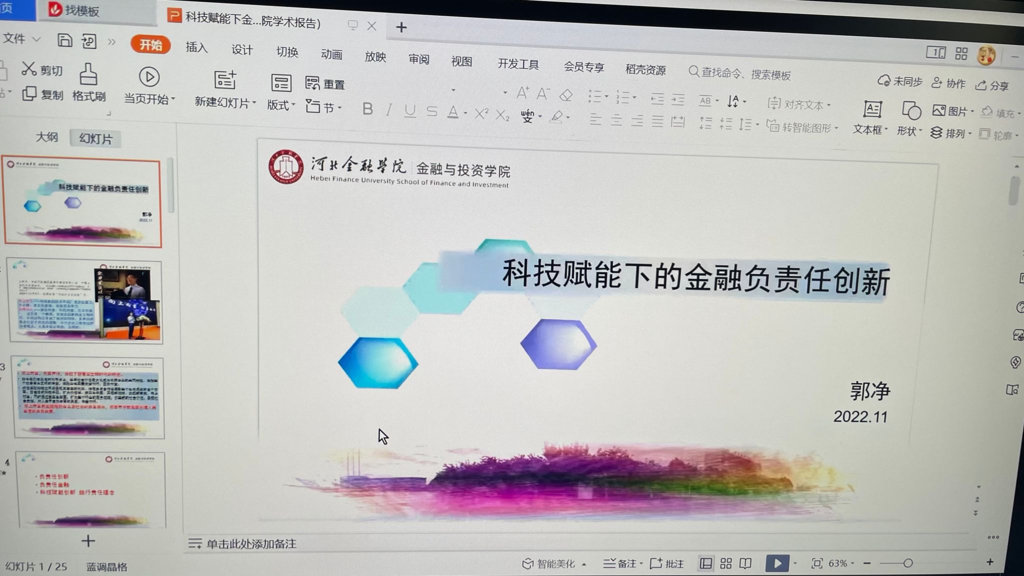 为进一步营造公司和我系的学术氛围,引导员工关注金融业界的前沿和热点问题,激发员工学习专业知识的热情,2022年11月25日下午3:30-5:00,金融工程系特邀河北金融公司金融与投资公司经理郭净教授,为本系全体师生,做了一场题为“科技赋能下的金融负责任创新”的学术报告。