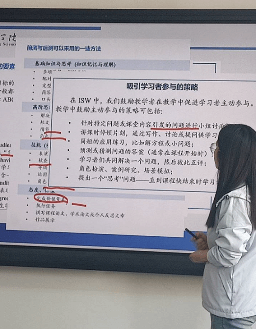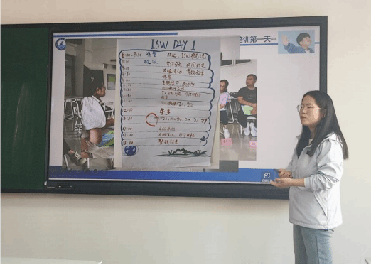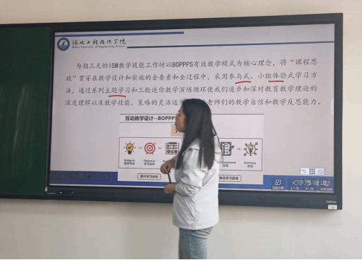 再次,张老师谈到了自己参加为期三天培训的实际情况和切身体会。教学技能工作坊(ISW)以BOPPPS(课程导入、学习目标、预评估、参与式学习、后评估、总结)有效教学模式为核心理念,将“课程思政”贯穿在教学设计和实施的全要素和全过程中,采用参与式、小组体验式学习方法,通过系列主题学习和三轮迷你教学演练循环使我们逐步加深了对公司产品理论的深度理解以及教学技能、策略的灵活运用。