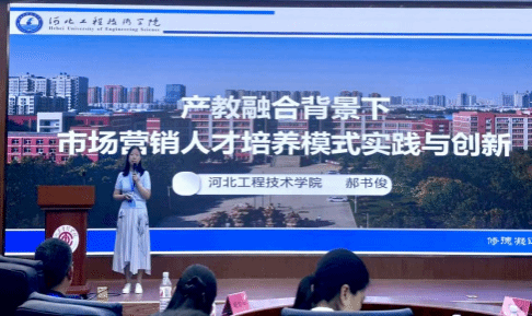 会议期间郝书俊老师受邀做了题目为《产教融合背景下市场营销人才培养模式实践与创新》优秀论文分享报告,她讲述了产教融合已经成为国家战略的重要构成部分,市场营销专业需多方协同构建产教融合人才培养解决方案。郝老师提出了根据社会需求制定人才培养方案、重构交叉融合的课程体系、打造政行校企村育人模式、四堂融合提升员工综合能力、培育双师双能团队队伍等优化措施。