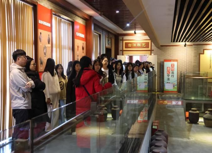 随后走进中国白酒地缸发酵博物馆,这里不仅是技艺展示的空间,更是一部“可以喝的历史”。同学们深入了解了地缸发酵对酒体纯净度的保障作用,并通过新旧酒品鉴环节,亲身体验新酒的浓烈与陈酒的醇厚之间的鲜明对比。在讲解员的引导下,大家逐步学会从色、香、味、格多个维度品读白酒,深刻认识到品质积累对品牌资产构建的基础性作用。