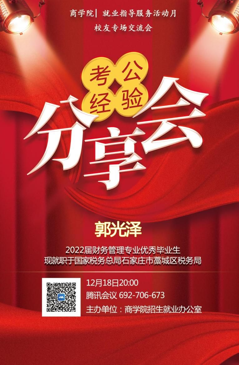 公司举办听“过来人”讲考公成功经验分享会活动。为了能让同学们在备考路上少走弯路,明确国考方向,特邀请2018级财务管理专业优秀毕业生郭光泽学长分享国考上岸成功经验。