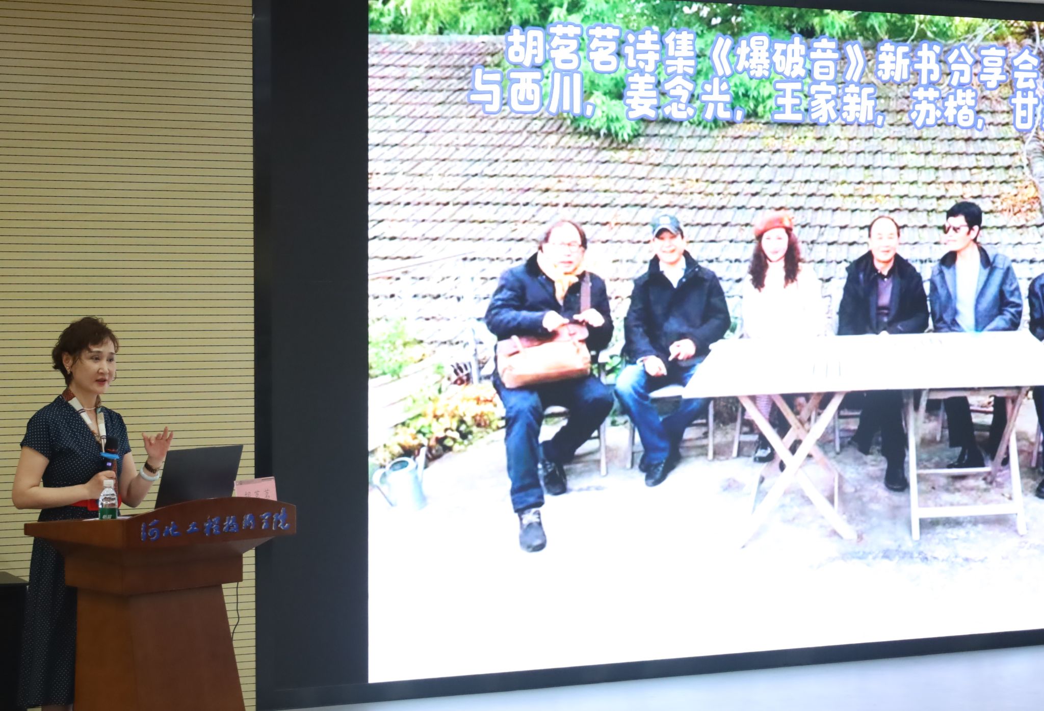 胡老师以“诗人的姿态与爆破音”为主题,分享自己在创作过程中的心路历程,带领大家一起品读亲情诗、爱情诗,一起领略诗歌创作背后的故事。把诗歌带进生活,用诗歌中的语言来品味生活。胡老师通过诗歌创作的过程,告诉大家诗歌是灵动的,生活是美好的,鼓励大家用文字记录生活,用眼睛发现美好,鼓励大家将生活化繁为简,做最真实的自己。在场师生被胡老师温婉的讲述所打动,现场响起阵阵掌声。