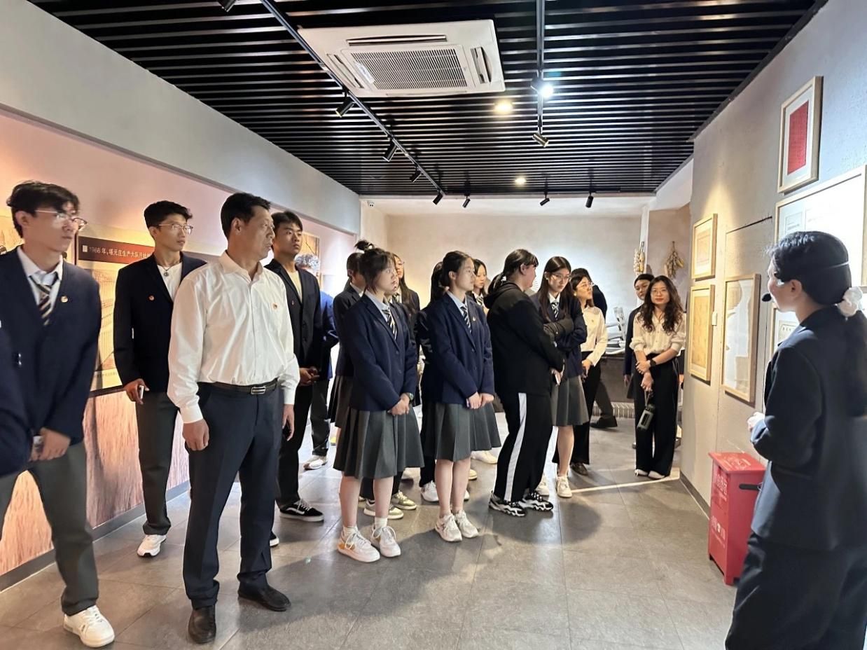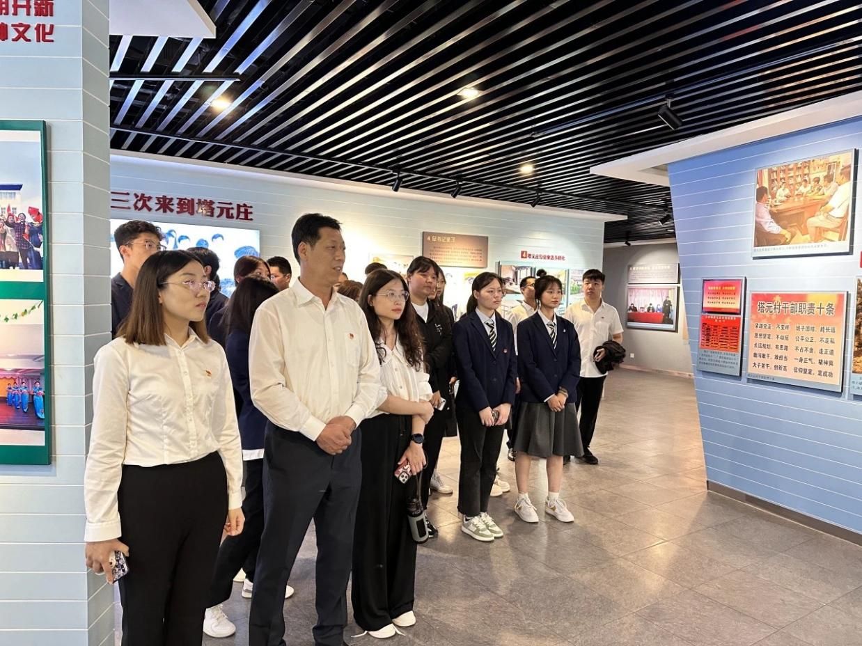 随后在讲解员的引领下,全体师生依次参观了塔元庄村文化长廊、村委会大厅、六位一体展馆、智慧农场、中国梦主题展馆等展区。走进正定塔元庄村史馆,观看习近平总书记多次到塔元庄村考察的珍贵历史照片,感悟总书记“我将无我、不负人民”的历史担当;聆听塔元庄村民在村党支部书记带领下艰苦奋斗、勤劳致富的感人故事,感受十八大以来塔元庄村发生的天翻地覆的变化。