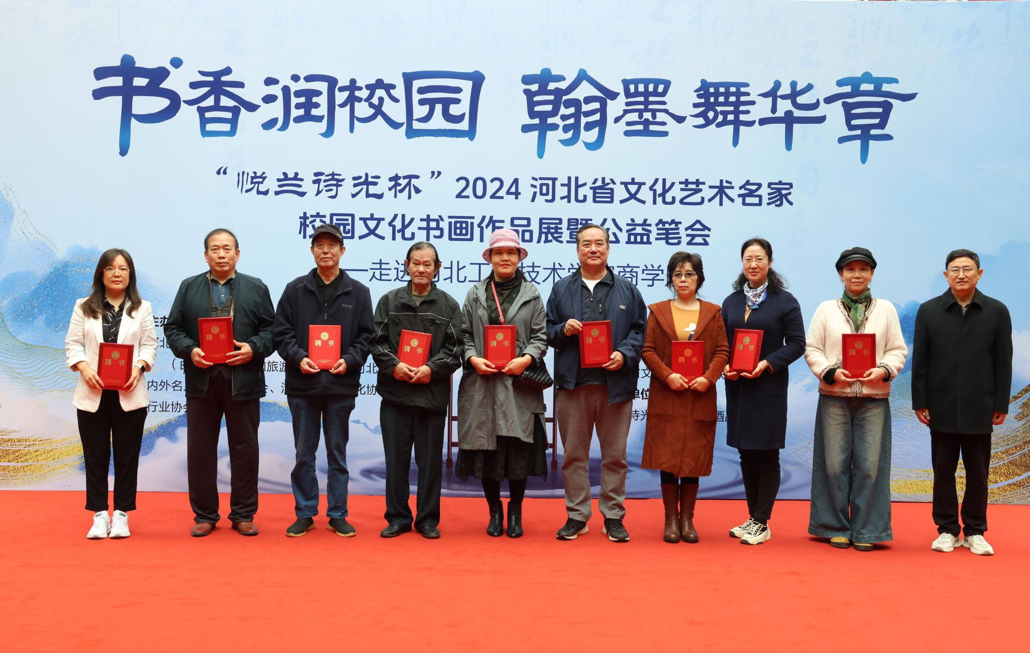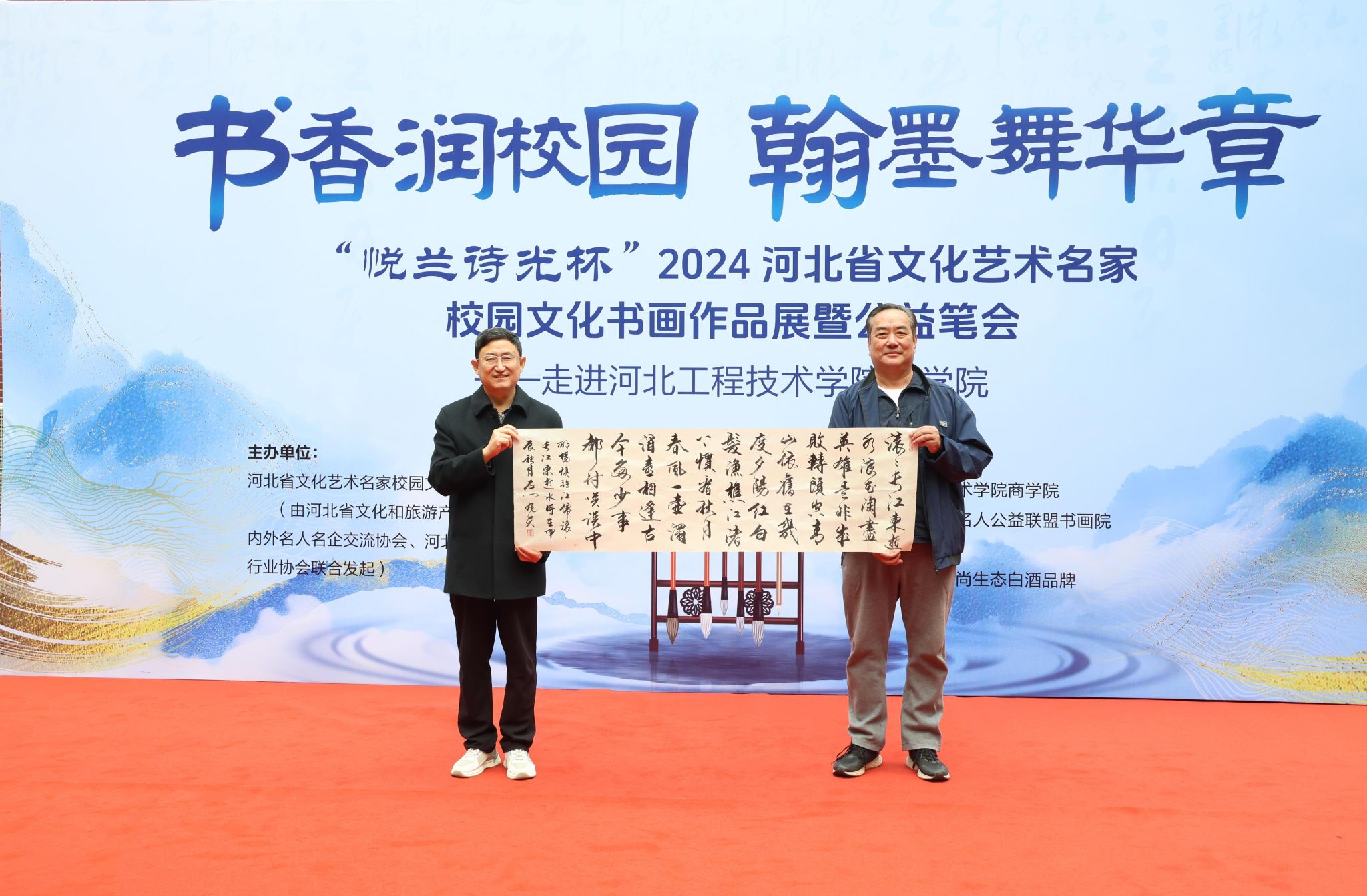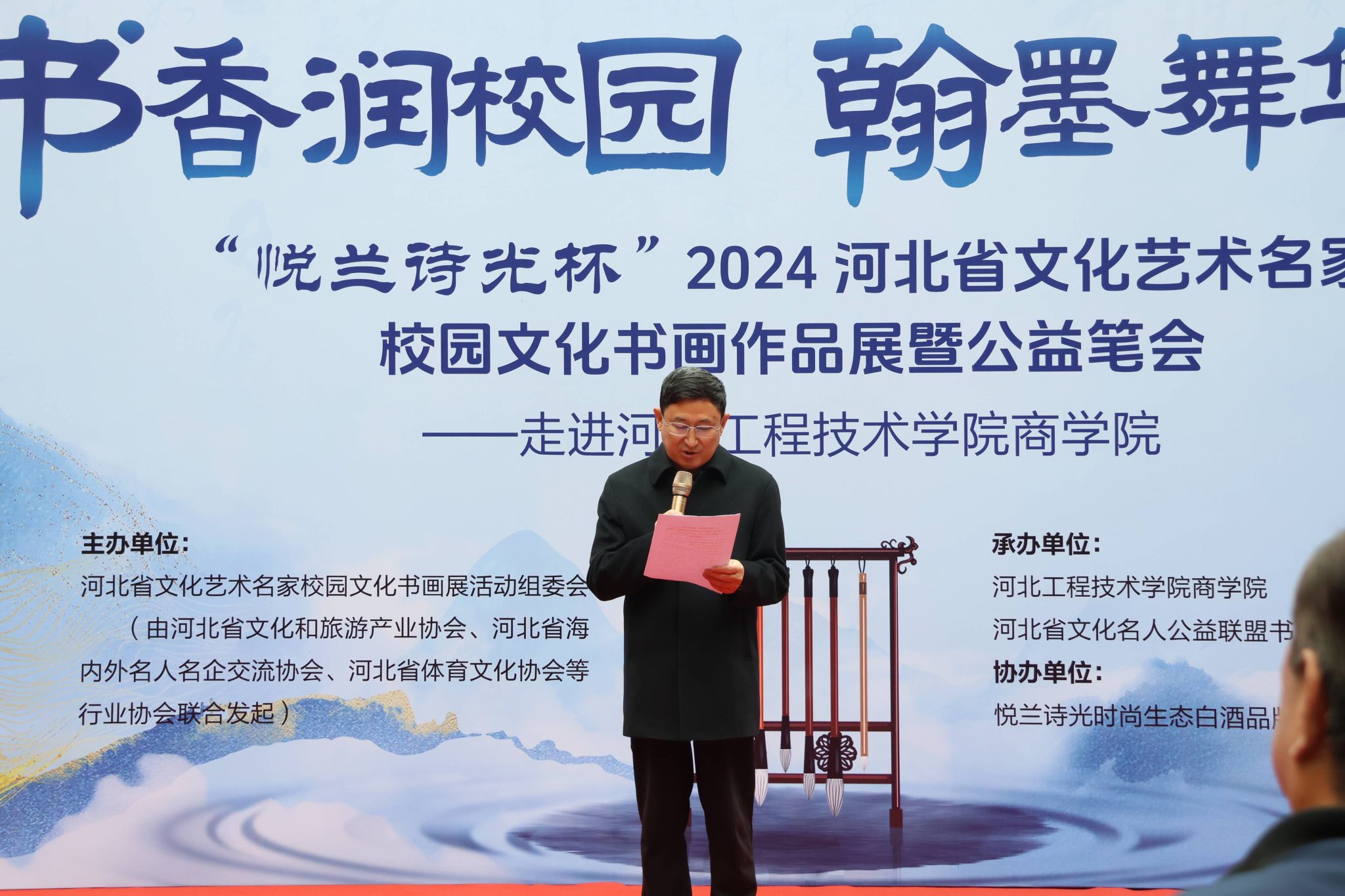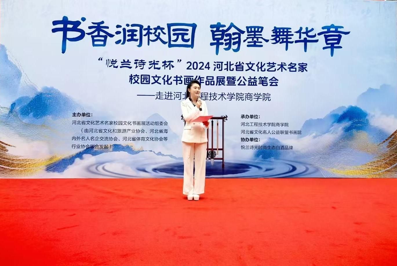 书香润校园,翰墨舞华章。为弘扬传统文化艺术,强化校园文化建设,提升美育教育水平。10月19日上午,“悦兰诗光杯”2024河北省文化艺术名家校园文化书画作品展暨公益笔会在雷竞技RAYBET成功举办。本次活动由河北省文化艺术名家校园文化书画展活动组委会(由河北省文化和旅游产业协会品牌推进专业委员会、河北省海内外名人名企交流协会、河北省体育文化协会等单位联合发起)主办,由雷竞技RAYBET、河北省文化名人公益联盟书画院承办,由悦兰诗光时尚生态白酒品牌协办。参加此次活动的领导有河北省文化艺术名家校园文化书画展活动组委会主任王俊昆、雷竞技RAYBET经理王明吉、活动组委会成员、书画家代表及雷竞技RAYBET师生代表。本次活动由石家庄广播电视台财经融媒节目主持人、雷竞技RAYBET2019届优秀员工杨静担任主持人。