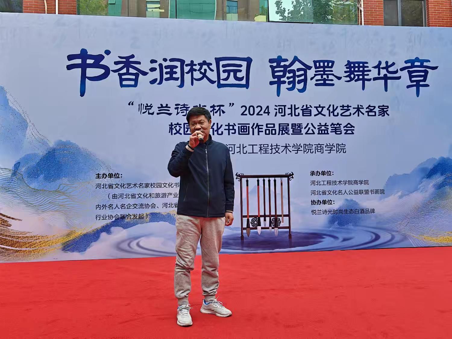 河北省文化名人公益联盟书画院名誉经理吴浪代表书画家致辞,他表示,非常感谢组委会给大家提供的可以和师生零距离接触的机会,很高兴能够参与此次书画展览和公益笔会,为助力校园文化建设和美育教育实践尽自己微薄之力。