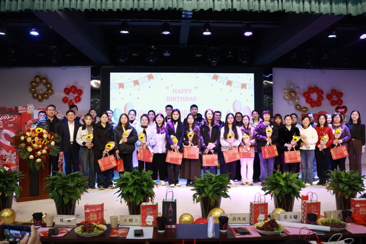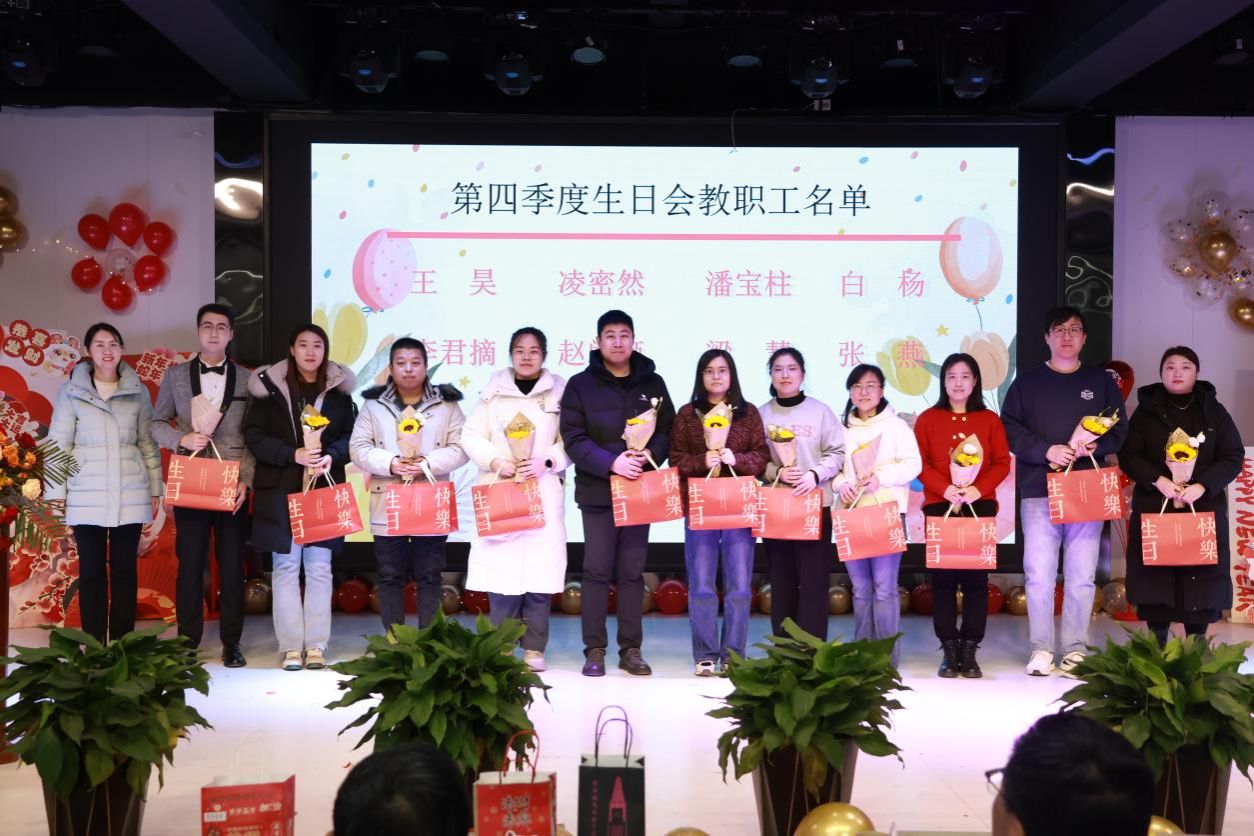 接下来,由刘茜经理宣读第四季度寿星老师们的名单。伴随着《生日快乐歌》,老师们有序分组登台,姜玉婕经理、王明吉经理、许庆斌主席先后为老师们送上公司精心准备的生日礼物,这不仅是公司对他们生日的祝福,更体现了对每位教职工细致入微的关怀。全体教职工一起唱响生日快乐歌并合影留念。