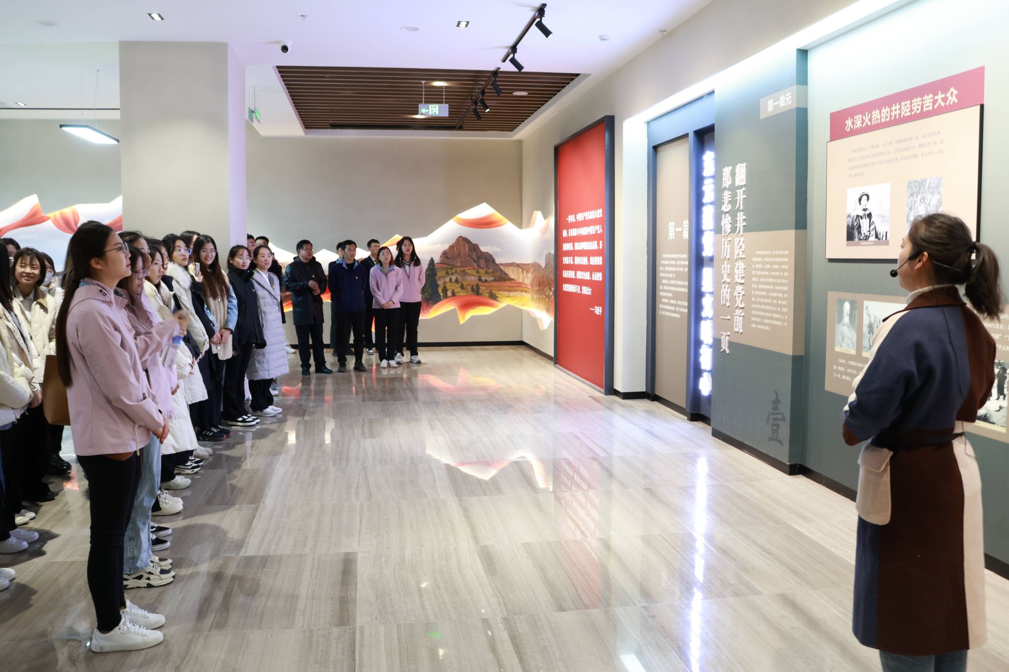 抵达井陉县爱国主义教育基地后,马克思主义公司专任教师沈子茹从井陉悠久历史、地理风貌、革命故事、民风民俗四个方面对井陉县进行了详细介绍。随后,研学师生在讲解员的带领下,参观百团大战主题馆、绵右渠主题馆、抗洪主题馆、太行天路主题馆大家被展览陈列的内容所深深吸引。通过历史文物、图文展陈、主题浮雕、人物雕塑和多媒体展示,研学师生更加全面地了解井陉县人民的英勇抗战历程,通过革命者的珍贵照片和实物,再现井陉人民在中国共产党的领导下争取民族独立的奋斗历程和辉煌成就。研学师生与井陉县爱国主义教育馆的工作人员进行深入交流双方就如何追寻红色记忆,厚植家国情怀”分享了各自的经验和见解,探讨了如何更好地传承和弘扬爱国主义精神。同学们积极发表自己的观点和建议,并表达了对井陉县爱国主义教育事业的赞赏。师生在一个个红色故事和历史场域中,感受英雄人物榜样力量,汲取红色文化精神。