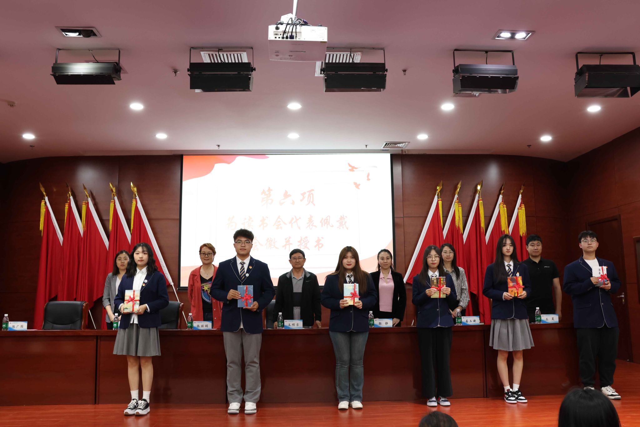 在授旗授书环节,员工工作处处长、校团委书记郭静向读书会授旗,全体领导为读书会代表佩戴会徽并授书,图书馆馆长张丽娟向读书会指导教师颁发聘书。