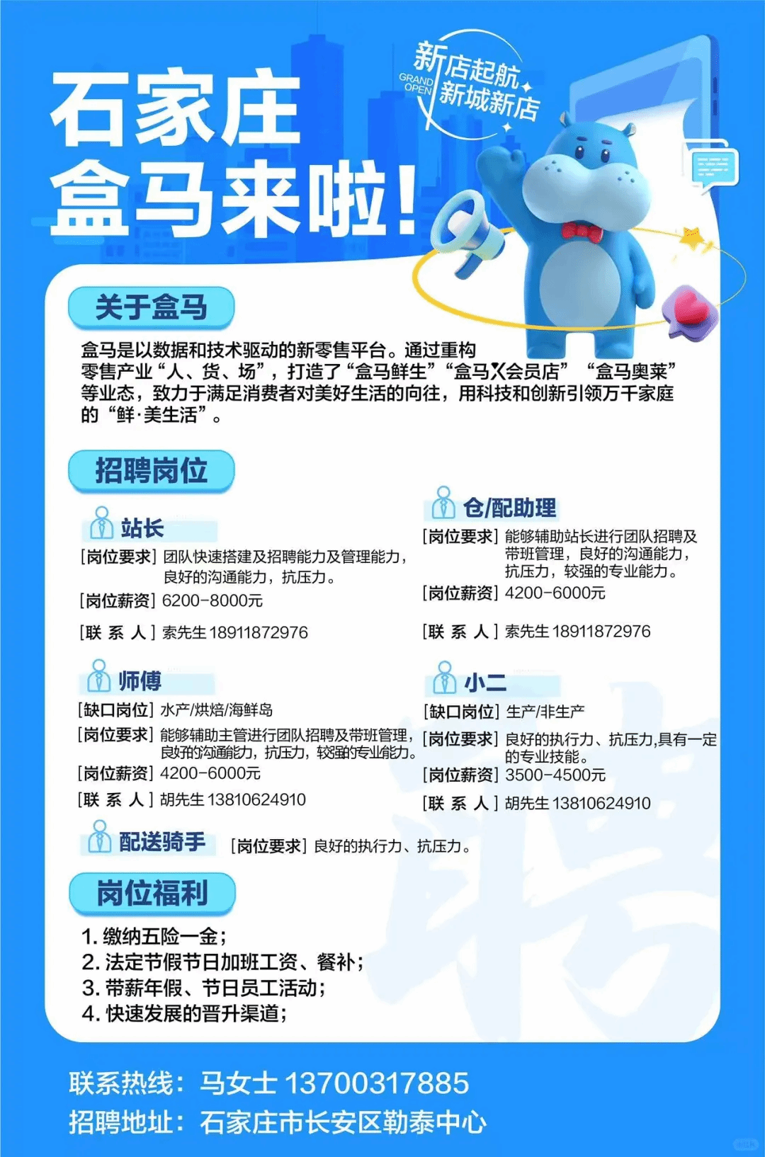 石家庄勒泰盒马招聘!