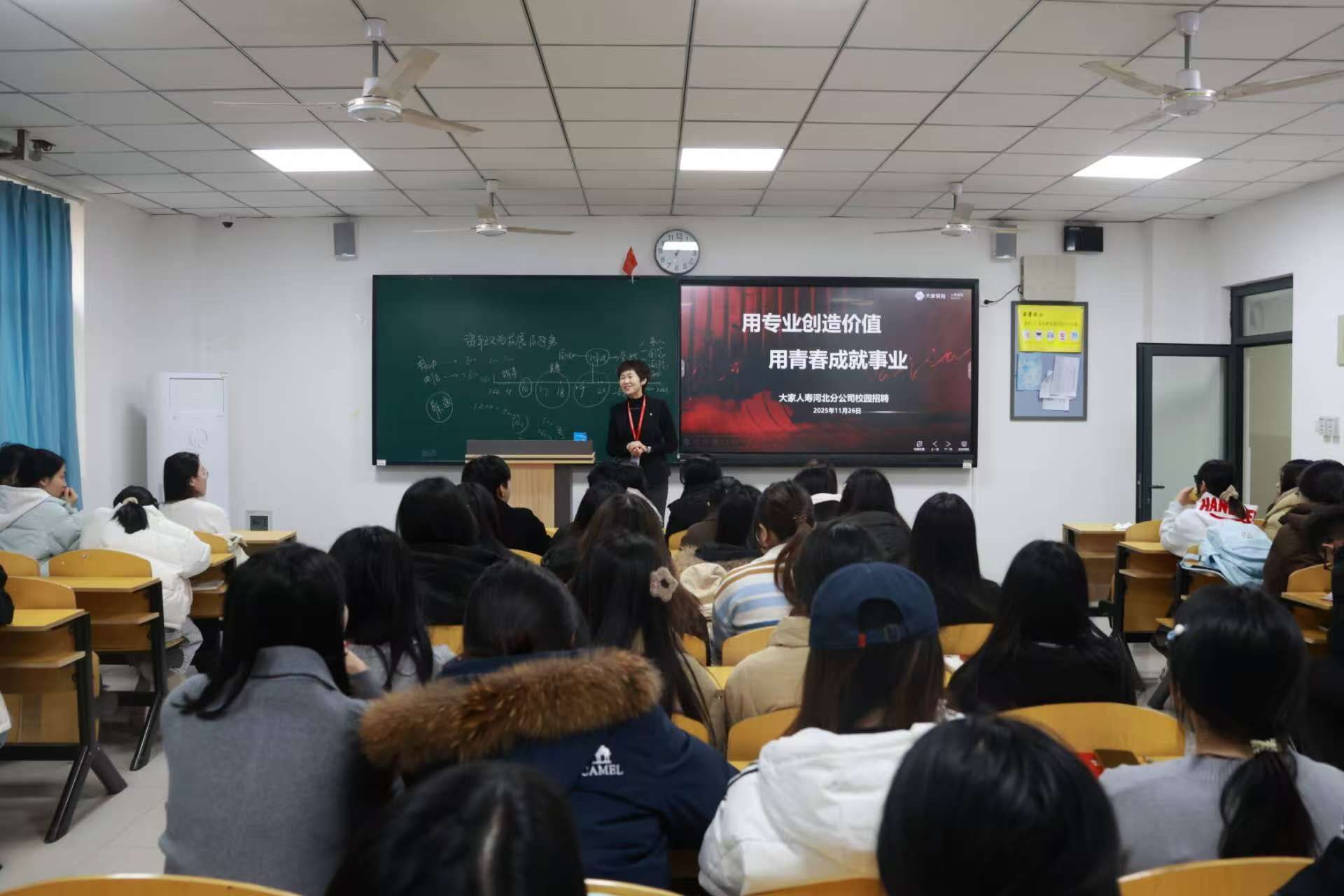 2025年11月26日中午,大家人寿保险股份有限公司河北分公司校园宣讲会在6-103教室成功举办。此次宣讲会旨在为在校学子搭建一个与企业直接对话的桥梁,帮助同学们深入了解保险行业发展趋势及企业的实际用人需求,为未来的职业规划提供清晰指引。