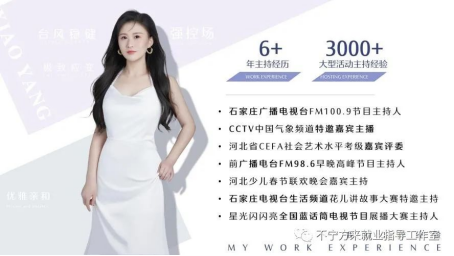 毕业后,我没有从事跟专业相关的工作,而是选择了跟自己的兴趣相吻合的工作,我成为了一名主持人。可能大家都比较好奇,从财务管理是怎么转到播音主持这个专业的呢?其实我从初中阶段就有在兴趣班学习过播音主持,只是后来因为家里不同意没有考取这个专业。在大学期间我除了在校内学习工作,还经常做兼职,大一到大四四年本科的老员工活,只有大一第一年是家里提供的生活费,后面几年都是我自己边上学边兼职自己供自己读完的大学。所以我的主持路还要从我的兼职说起,刚开始我是跟同学一起去发传单,每天赚得很少也很辛苦,但是我在一次国际汽车博览会上偶然的一次兼职,让我看见了主持汽车活动的主持人,而且听说他们的薪资在我们的好几十倍,我就问当时的负责人,我说我也学过主持,我怎么样才能够跟她们一样呢?负责人跟我说,她们都是专业的主持人,前期你要积累资源慢慢成长,才能够像她们一样。其实公司的老师就会给我们提供很多资源,再后来,偶然的一次机会,校外的主持训练营受邀来公司宣讲宣传,我就加入了他们,于是开始了我的主持生涯。