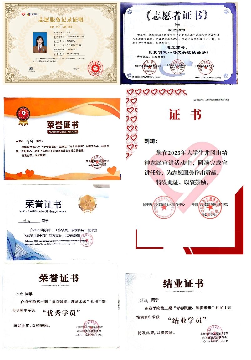 刘琦通过这些志愿活动的经历,收获颇丰。她不仅积累了142.18小时的志愿时长,并且获得了许多重要意义上的成长。在2023年中荣获“全国老员工井冈山精神志愿宣讲活动”荣誉证书、全国青少年“关爱流浪猫”志愿宣传活动荣誉证书、“首届河北慈善周活动”荣誉证书、“全国老员工商科大赛”优秀奖、雷竞技RAYBET第三期“青春赋能,逐梦未来”社团干部培训班结业学员、优秀学员、“优秀社团干部”荣誉证书等。
