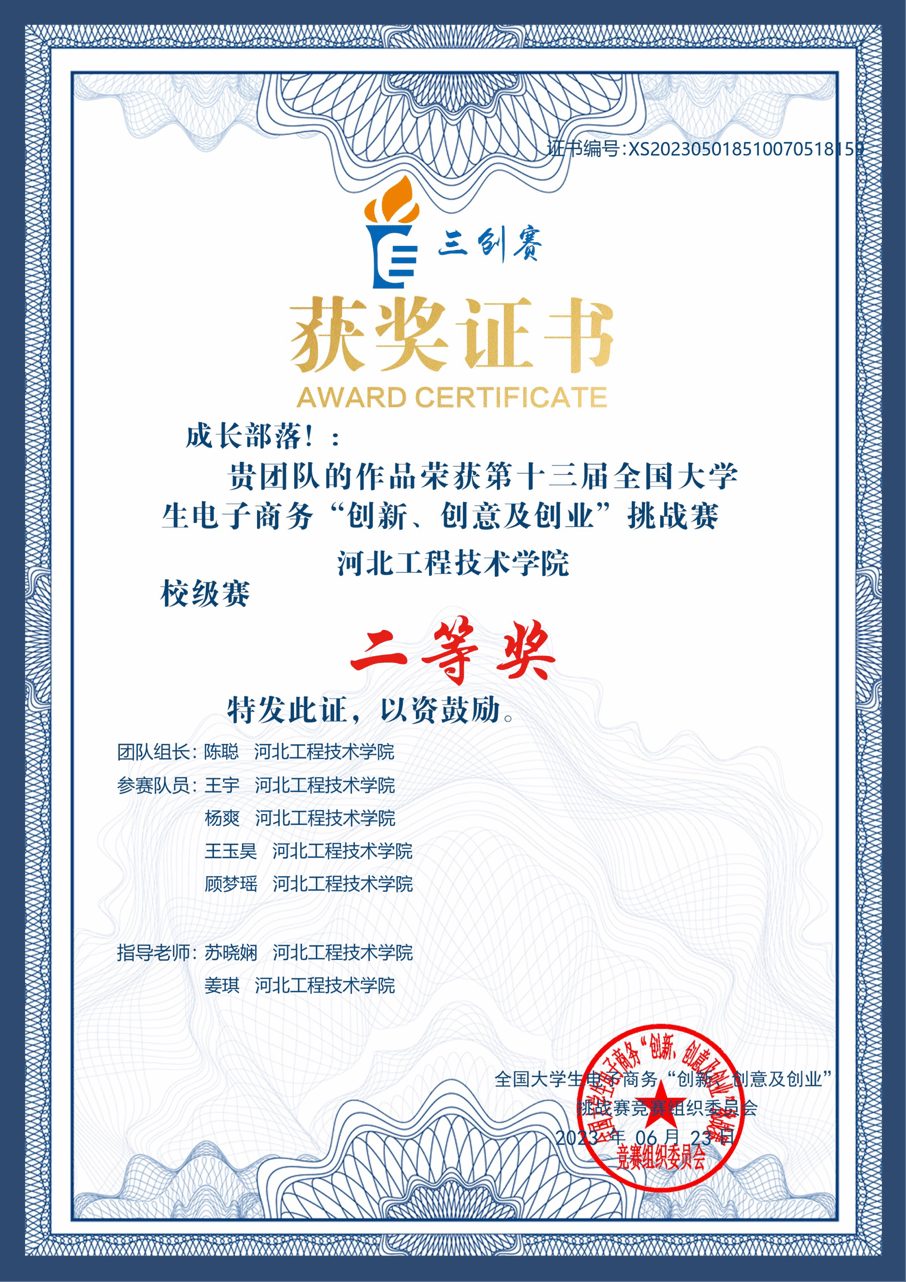 2023年6月荣获第十三届“创新、创意及创业”挑战赛“校级二等奖”;