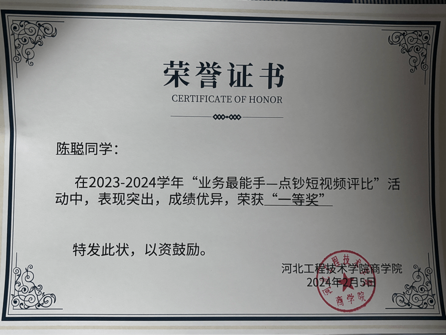 2024年2月5日荣获“业务最能手-点钞短视频评比”“一等奖”。