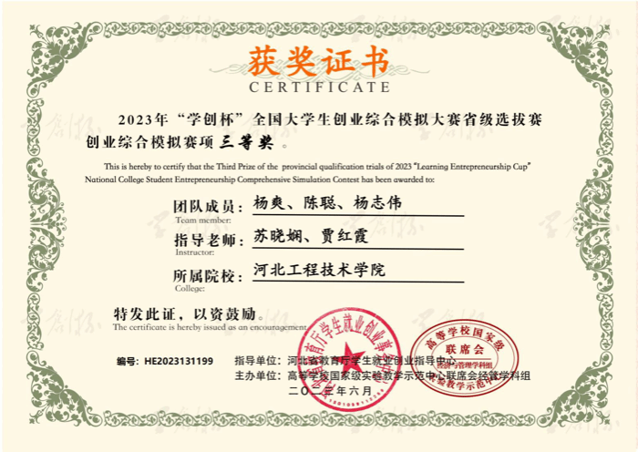 2023年3月24日荣获2023年“学创杯”创业综合模拟赛项院级“三等奖”;