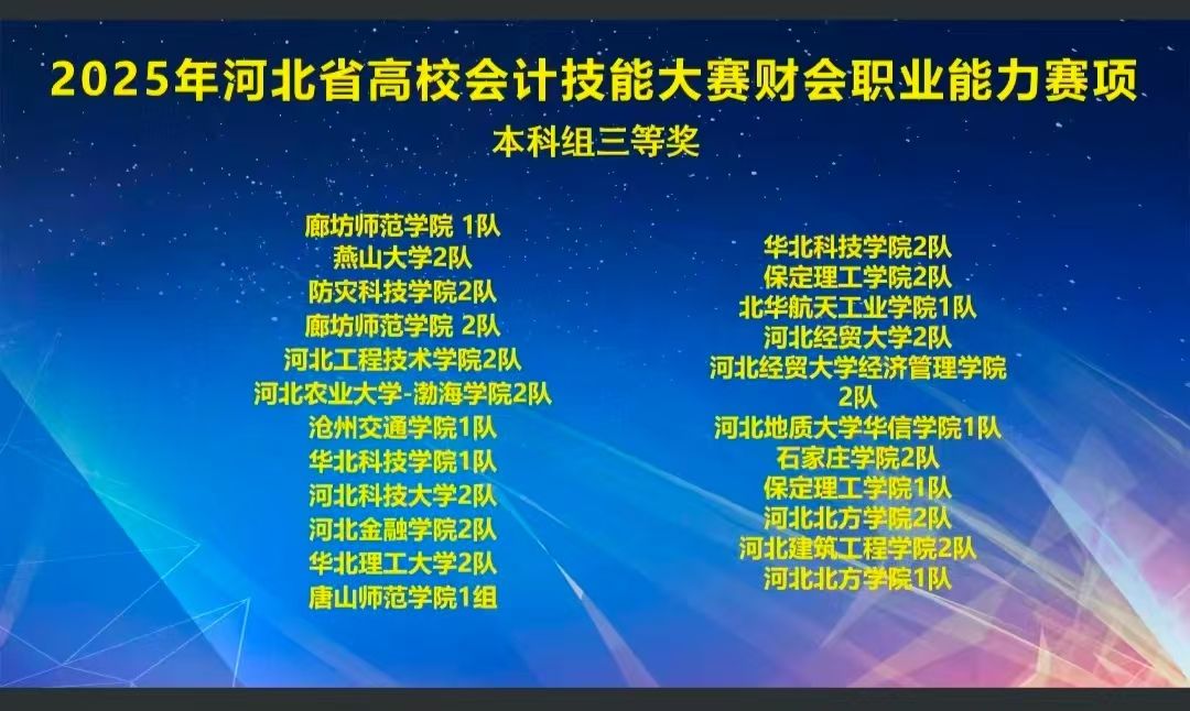 2025 年 10 月 18 日,由河北省教育厅举办的河北省会计技能大赛财务会计职业能力赛项在石家庄圆满落幕。公司精心选拔的参赛团队凭借扎实的专业功底、默契的团队协作与高效的实战能力,最终荣获本科组三等奖一项,充分展现了公司专业人才培养的过硬质量与学子们的专业风采。