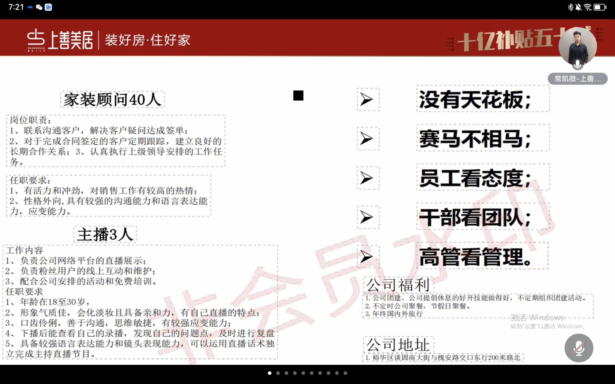 本次招聘会首先由上善美居招聘经理常凯奇向在场同学进行自我介绍和企业文化,展示了司自建立以来,秉持着家是有温度的定义,一个温度的全新生活方式的加等于户型优化系统+全屋收纳系统+生活方式全案系统+主材配套系统+软装陈设系统+智慧家居系统佳家居用品系统+客户终身价值服务系统。将集团精心打造为建一流工程、创一流业绩的品牌企业的历程。并且,就公司目前所拥有的资质,所获奖项,以及公司之前承建的各个项目等企业历史一一向同学们做了详细的介绍。