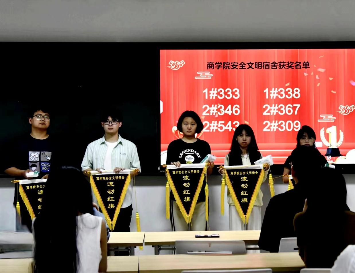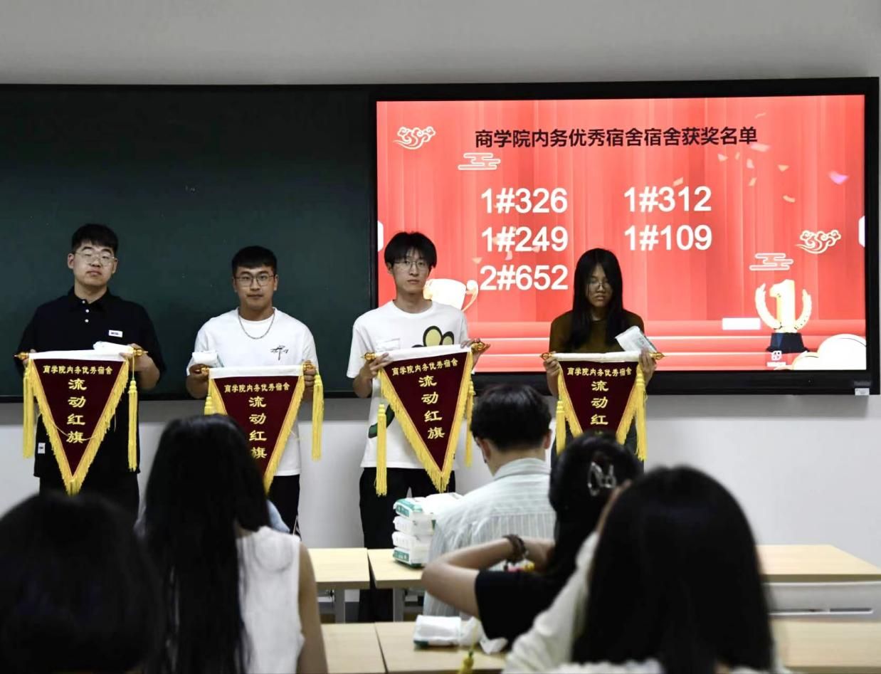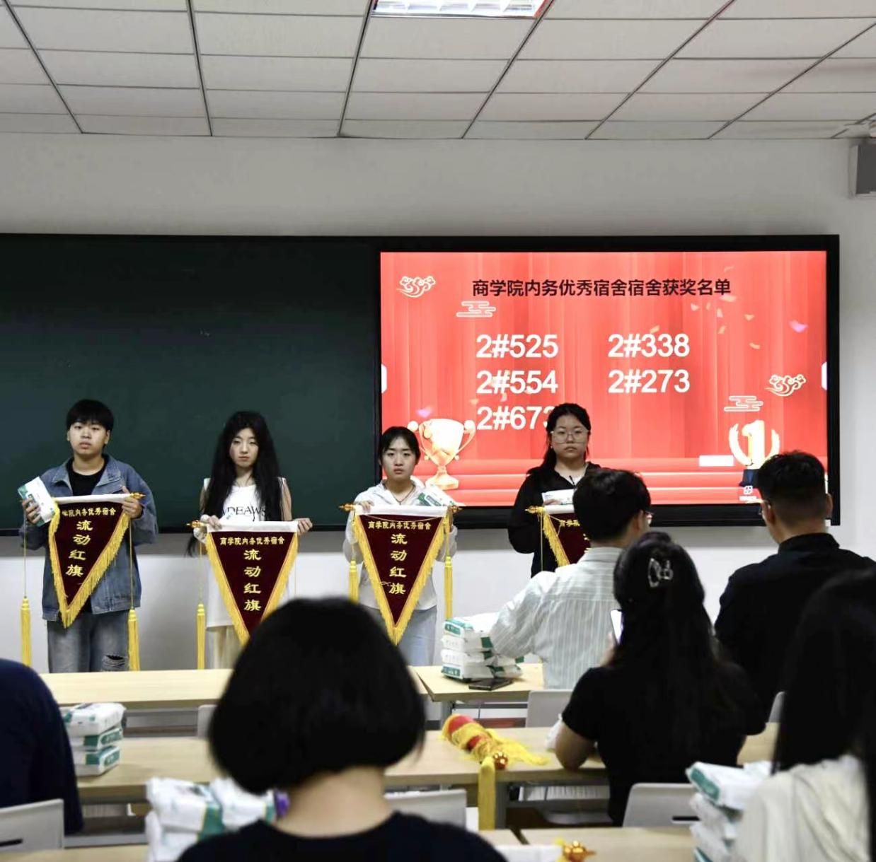 雷竞技RAYBET自律委工作人员、安全文明宿舍代表和内务优秀宿舍代表参加颁奖仪式。通过4月综合评比,共有6间宿舍获得“安全文明宿舍”和10间宿舍获得“内务优秀宿舍”荣誉称号。工作人员对以上优秀宿舍颁发流动红旗及奖品以资鼓励,并组织了以上优秀宿舍代表进行拍照留念。